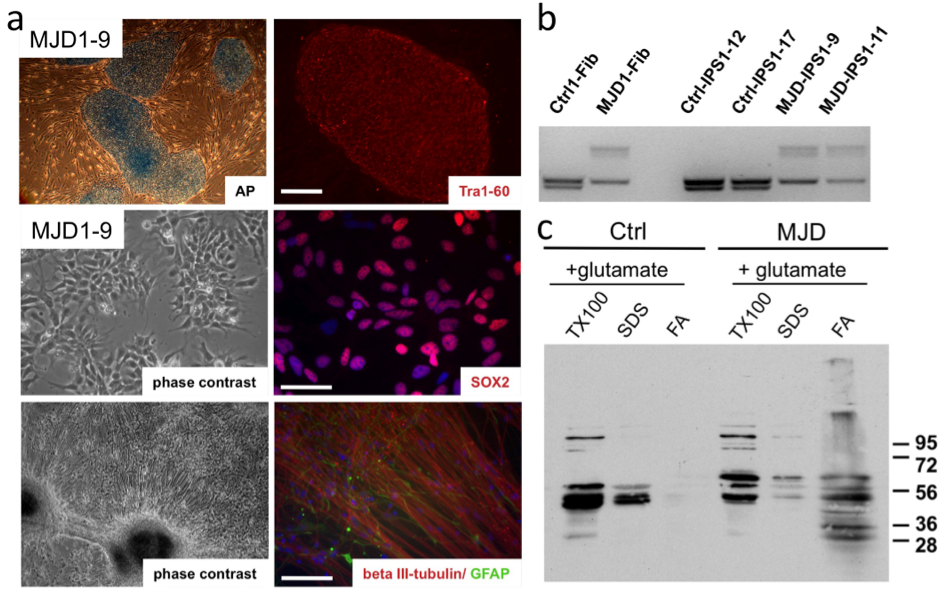 Excitation induces aggregation of ATXN3 in patient-derived neurons. iPSCs (clone MJD1-9) generated from patient-derived fibroblasts express the pluripotency-associated markers alkaline phosphatase (AP) and Tra1-60 (a, upper panel). From the iPSCs we generated neural stem cells expressing Sox2 (a, middel panel) which, upon growth factor withdrawal, differentiate into dominant fractions of beta III-tubulin(+) neurons and a minor fraction of GFAP(+) astrocytes (a, lower panel). The CAG-containing exon 10 is expanded in MJD patient-derived cells and not in cells of healthy control donors (b). Stimulation of neurons with the excitatory neurotransmitter L-glutamate induces the formation of SDS-insoluble aggregates in MJD-derived neurons and not in control neurons (FA lane, c). FA, formic acid; TX100, TritonX-100.